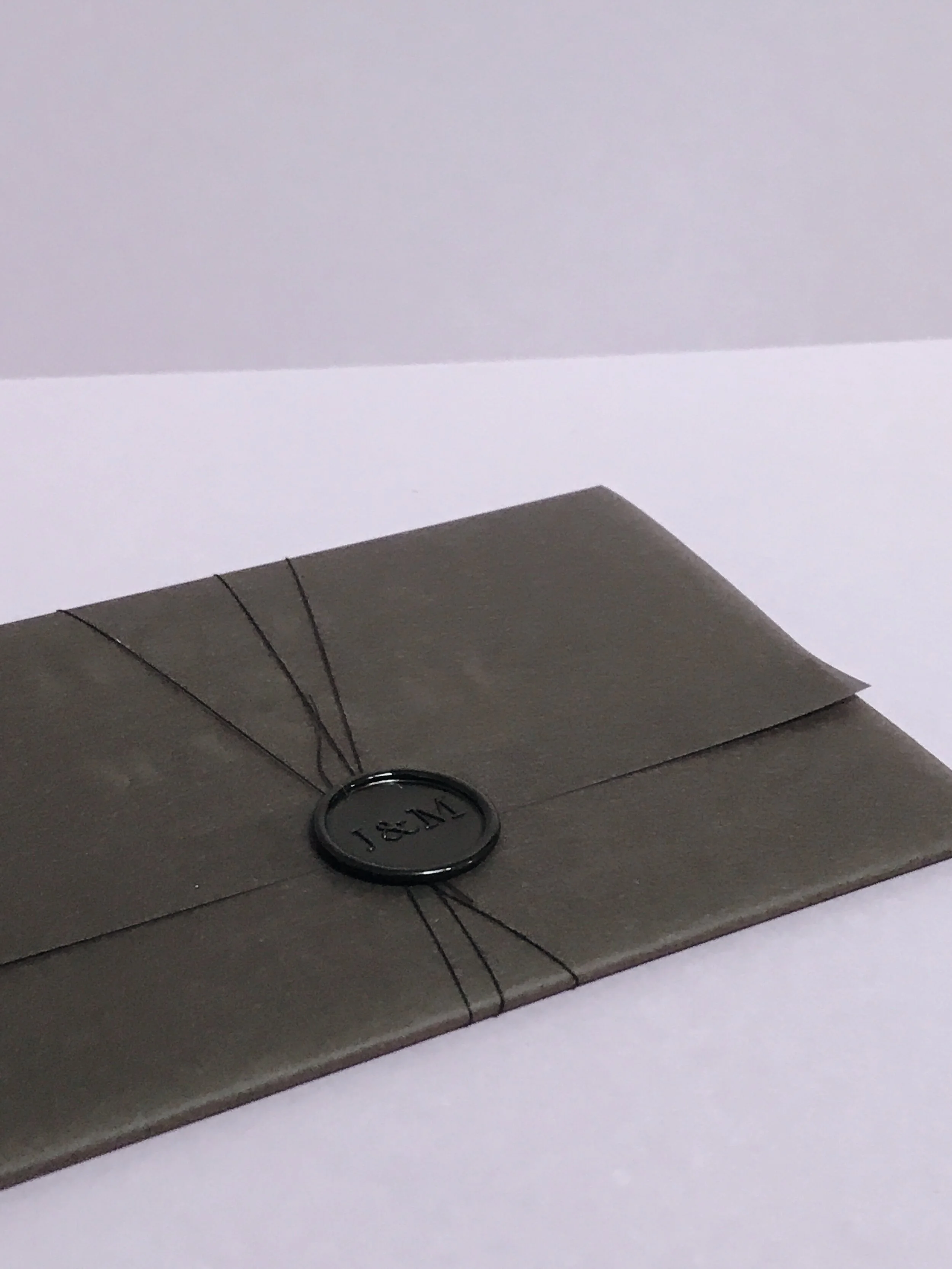 Adding some black thread and a wax seal with the couple’s initials to hold the vellum together made the whole package look really sleek and sophisticated.
