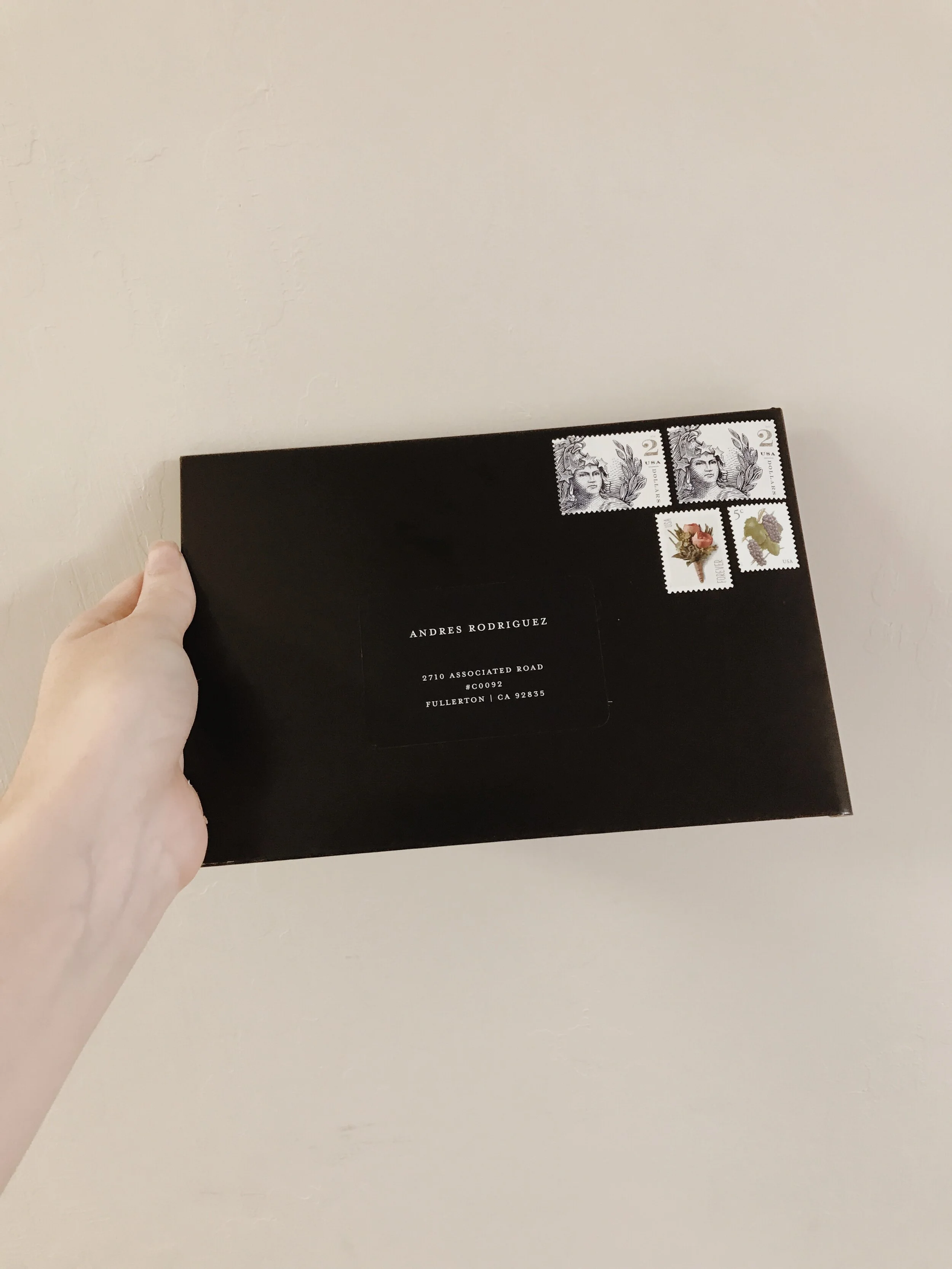 The final step is of course to send out the invitations. Figuring out how much postage would be was a bit tricky. Once the acrylic pieces arrived, I weighed them on the digital food scale I have at home to get an estimate of how much each piece would be, and added a few ounces for the vellum, seals, envelope, etc. I estimated about $5 per piece, which was slightly more than they turned out to be, but pretty close!